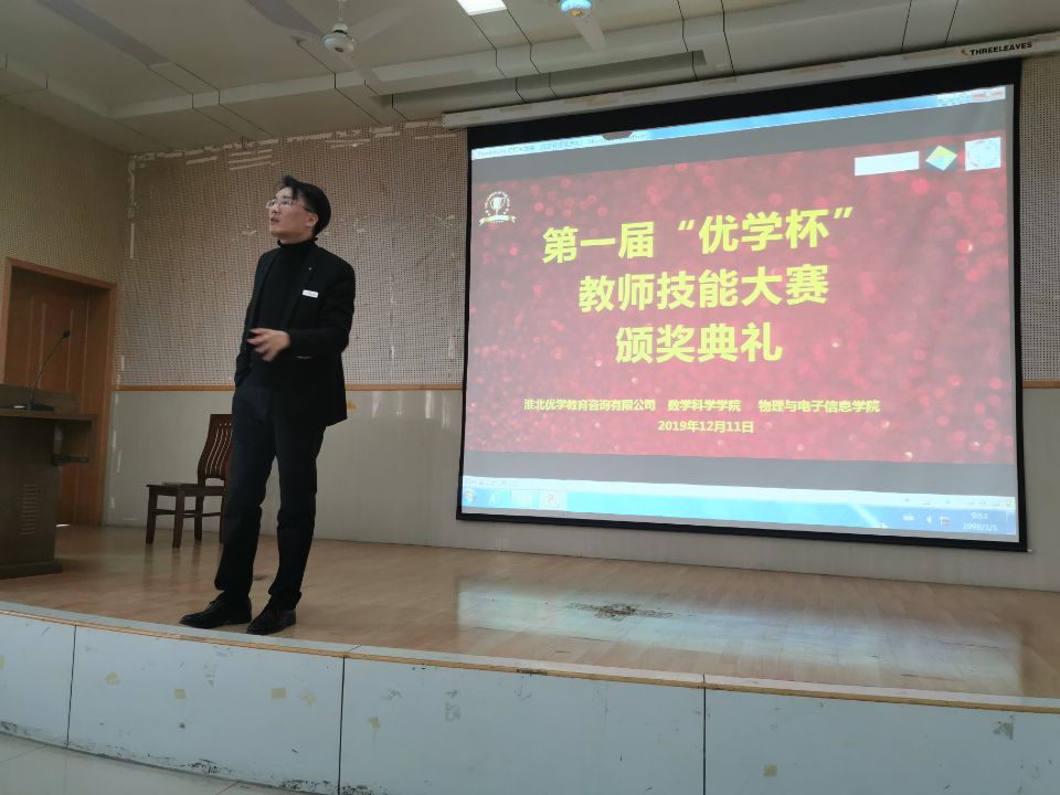 2019年12月11日,威廉希尔体育在文南213成功举办第一届“优学杯”教师技能大赛颁奖典礼。威廉希尔体育副经理袁广宇、淮北市优学教育咨询有限公司董事长李仁志、威廉希尔体育团委书记胡亚楠、淮北优学教育咨询有限公司人力资源部主管刘丽及员工代表300余人参加颁奖典礼。